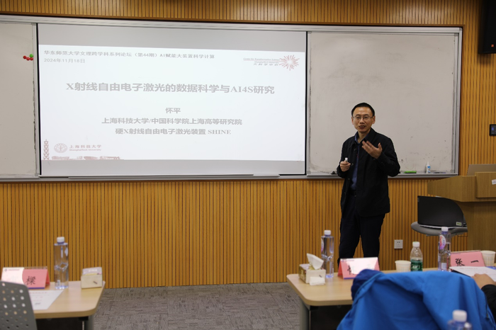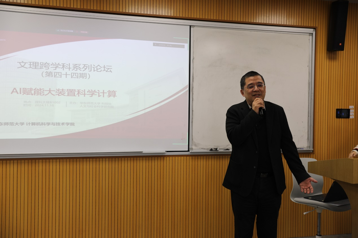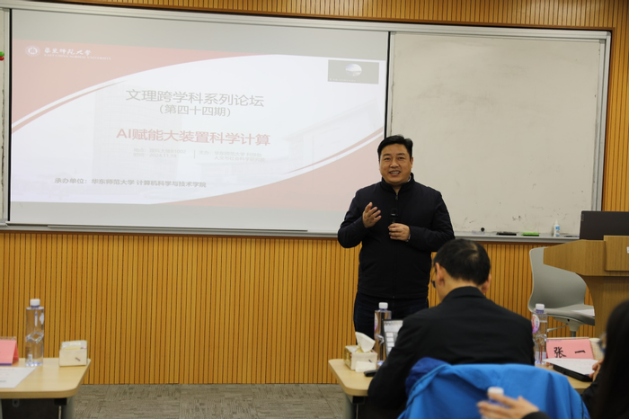 2024年11月18日下午,华东师范大学学科交叉融合论坛(第四十四期)在理科大楼B座1002室和线上腾讯会议同步举行,论坛主题为“AI赋能大装置科学计算”。围绕人工智能如何赋能大科学装置的数据计算和处理,论坛邀请了上海科技大学的怀平研究员、中国科学院高能物理研究所的张一副研究员、中国科学院上海高等研究院的王春鹏副研究员、华东理工大学物理学院副院长张孟副教授,以及华东师范大学计算机与科学技术学院的林绍辉研究员作特邀学术报告,并共同参与圆桌讨论。本次论坛由华东师范大学科技处、人文与社会科学研究院主办,虎牙直播 承办。计算机与科学技术学院何高奇教授负责组织这次论坛并主持了五场特邀报告。来自华东师范大学、上海科技大学、上海交通大学、中国科学院上海应用物理研究所、上海科技馆等机构的五十余人参与了此次论坛,其中线下参会三十余人。