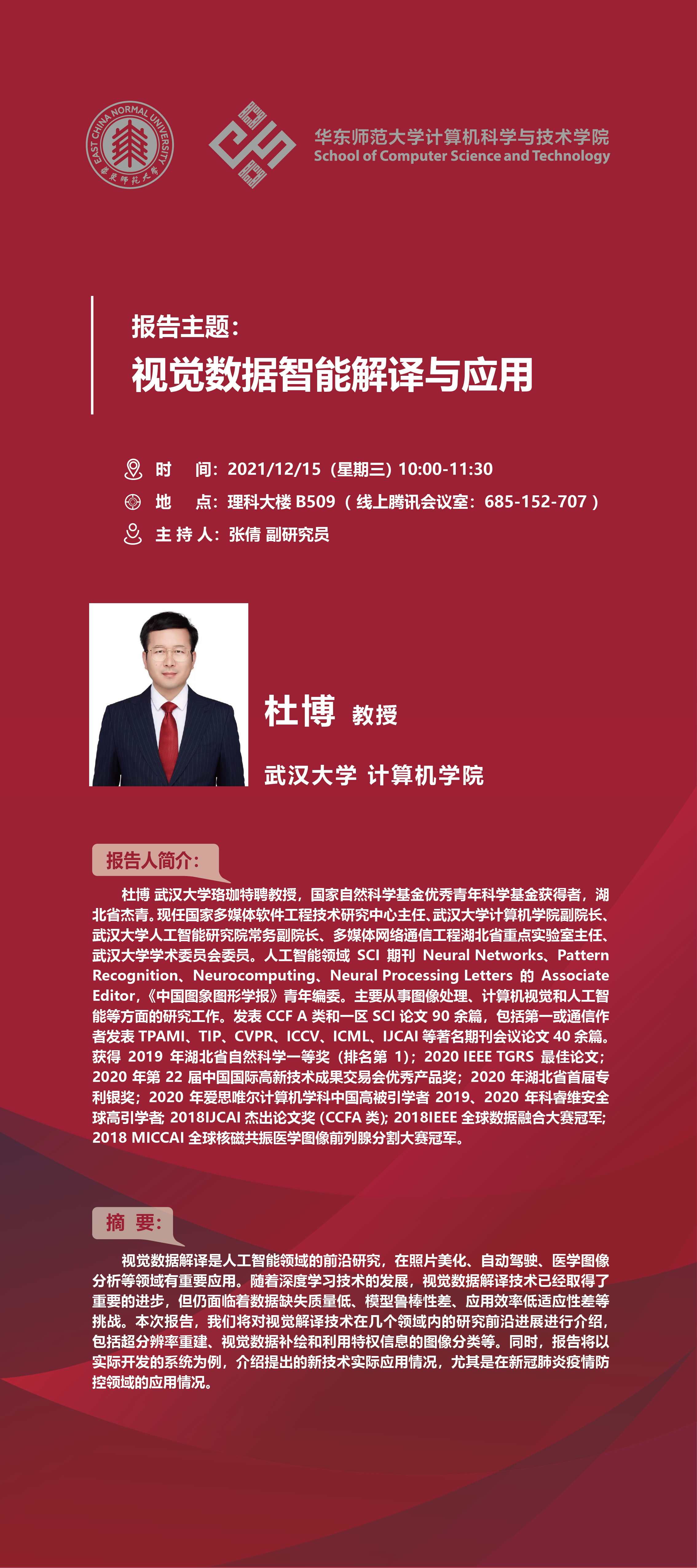 杜博,武汉大学珞珈特聘教授,国家自然科学基金优秀青年科学基金获得者,湖北省杰青。现任国家多媒体软件工程技术研究中心主任、武汉大学虎牙直播 副院长、武汉大学人工智能研究院常务副院长、多媒体网络通信工程湖北省重点实验室主任、武汉大学学术委员会委员。人工智能领域SCI期刊Neural Networks、Pattern Recognition、Neurocomputing、Neural Processing Letters的Associate Editor,《中国图象图形学报》青年编委。主要从事图像处理、计算机视觉和人工智能等方面的研究工作。发表CCF A类和一区SCI论文90余篇,包括第一或通信作者发表TPAMI、TIP、CVPR、ICCV、ICML、IJCAI等著名期刊会议论文40余篇。获得2019年湖北省自然科学一等奖(排名第1);2020 IEEE TGRS最佳论文;2020年第22届中国国际高新技术成果交易会优秀产品奖;2020年湖北省首届专利银奖;2020年爱思唯尔计算机学科中国高被引学者2019、2020年科睿维安全球高引学者;2018IJCAI杰出论文奖(CCFA类);2018IEEE全球数据融合大赛冠军;2018 MICCAI全球核磁共振医学图像前列腺分割大赛冠军。