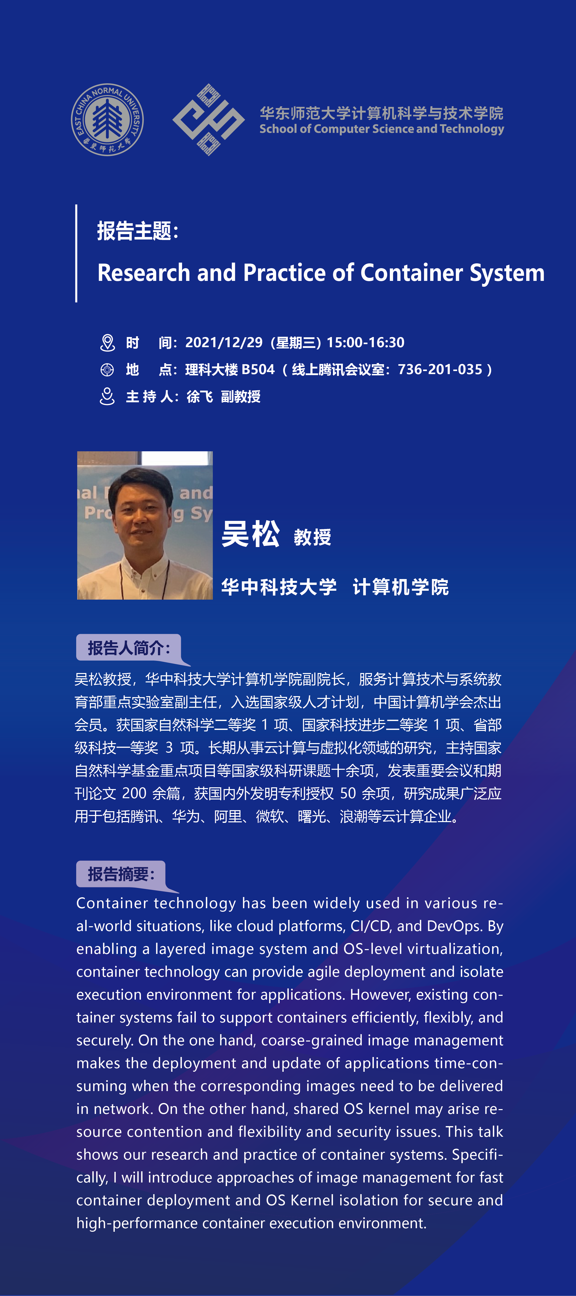 Container technology has been widely used in various real-world situations, like cloud platforms, CI/CD, and DevOps. By enabling a layered image system and OS-level virtualization, container technology can provide agile deployment and isolate execution environment for applications. However, existing container systems fail to support containers efficiently, flexibly, and securely. On the one hand, coarse-grained image management makes the deployment and update of applications time-consuming when the corresponding images need to be delivered in network. On the other hand, shared OS kernel may arise resource contention and flexibility and security issues. This talk shows our research and practice of container systems. Specifically, I will introduce approaches of image management for fast container deployment and OS Kernel isolation for secure and high-performance container execution environment.