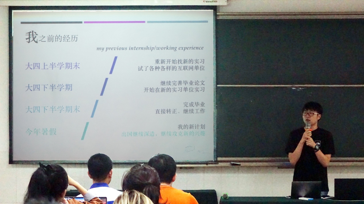 2018届毕业生、前七牛云算法工程师殷正航向大家进行了工作实习经验分享。殷正航结合自身经历,提醒大家关注招聘信息,同时要平衡好工作实习与毕业论文之间的关系,找准自己的位置,使自己的潜能得到最大发挥。