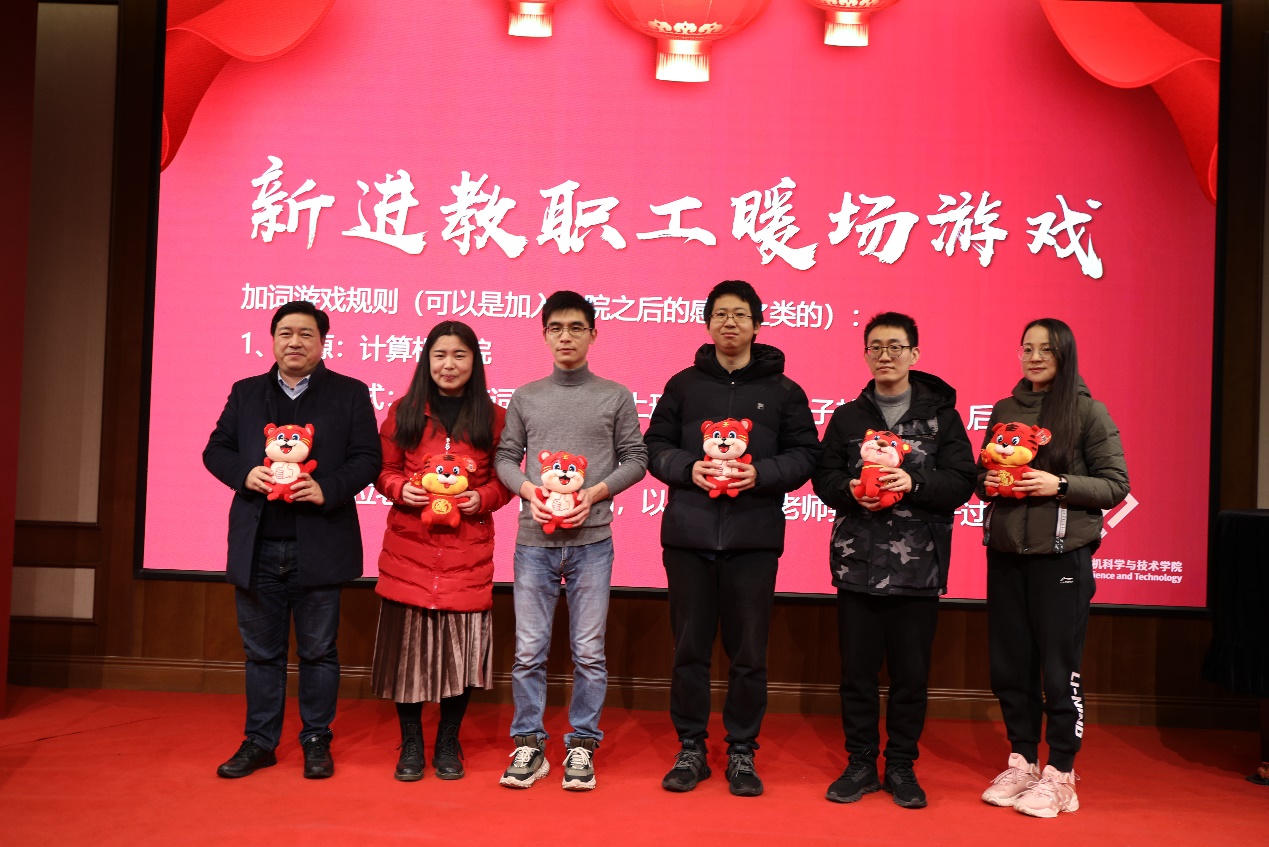 2021年新进教职工上台进行自我介绍,共同参与趣味加词游戏。以“虎牙直播 ”为词源,描述自己入职以来对学院的感受,他们纷纷提到,虎牙直播 是一个其乐融融、和谐有爱、蒸蒸日上的温暖大家庭。