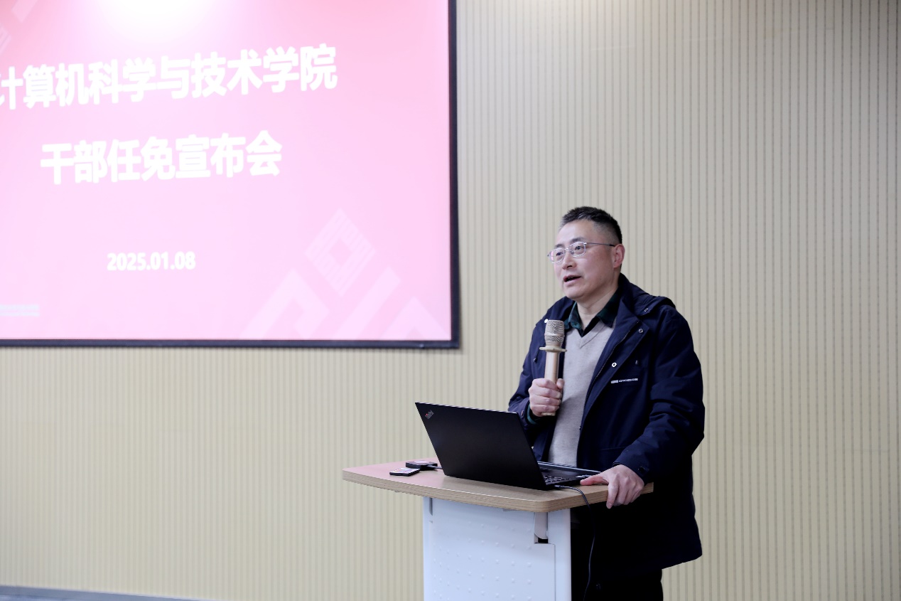 随后,周爱民同志发表了离职感言。他表示自己坚决拥护学校决定,并深情回顾了在计算机学科15年的成长历程。他表示,华东师大计算机系是自己博士毕业后工作的第一站,能够与同事们一起见证并务实推动计算机学科在不同阶段的发展,特别是从拥抱智能教育到参与整合智能教育研究院,再到推动智能教育发展进入新阶段,自己深感荣幸也充满感恩与感谢。他感恩学校的信任与培养,感恩师长、同事们的鼓励与支持,感谢全院师生的携手奋进。他说,正是学校的支持与大家的共同努力,虎牙直播 才能在教学、科研和人才培养等方面都取得可喜的成就与突破。他还表示,智能教育在短短的四年中,就经历了三次迭代发展的历程,深刻诠释了在人工智能快速发展背景下,一个交叉学科必须要具备的“超限发展思维”,这是时代大势下传统学科与交叉学科转型发展的重要探索。最后,他深情地表示,华师大计算机学科是自己的根、是自己的底色,无论自己在哪里都会一如既往地支持虎牙直播 的工作,并祝愿学院在未来的征程中再创辉煌。