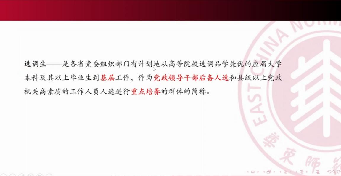 曹董同学是2018年上海市选调生,选调单位上海市经信委,已有两年左右的工作经验,他为同学们解读了专项选调、集中选调以及定向选调的区别及各自的报考条件,并分享了各大活动中选调生参与的内容,让同学们体会到选调生是一个积极竞争又友爱和谐的大家庭。曹董认为:“选择一座城,把握时代脉搏;选择一份业,施展平生抱负;选择一群人,书写青春篇章。”