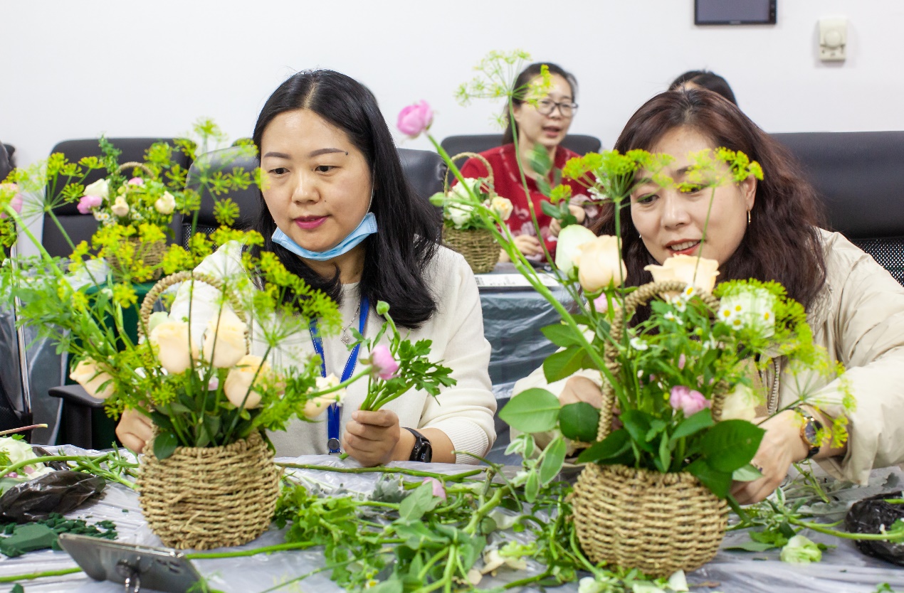 活动中,女教师们在花艺老师的讲解下,结合各自手中的花材特点和审美情趣,从鲜花的取材、剪叶、构图、布局开始,不断地进行尝试和实践。经过一个小时的亲手实践,一盆盆错落有致、生机盎然、创意十足的插花作品展现在大家眼前,令人赏心悦目。