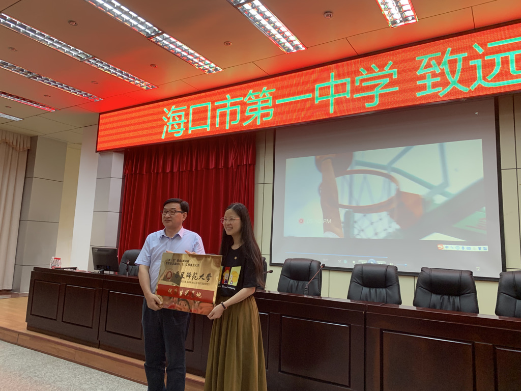 5月13日下午,招生组来到海口市第一中学,受到了学校领导和师生的热烈欢迎。招生组组长陈蕾代表华东师范大学向海口市第一中学授予“华东师范大学优质生源基地”牌匾,主持工作副校长笪旭代表海口一中接受授牌。招生组李晨辉博士登上海口一中“致远大讲堂”,为师生学生作了题为“技术与艺术的融合——探索数据可视化之美”的科普报告,现场气氛热烈,互动频繁。招生组同时向师生分发华东师范大学的宣传材料,并在讲座后耐心解答了同学们关于华东师范大学的相关问题。