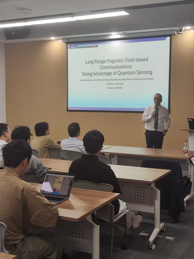 之后,Barbeau教授面向我院师生做了以量子传感为主题的学术报告。报告深入浅出地介绍了量子传感这一创新技术在长距离磁通信中的作用,特别是可以为解决复杂环境下(如地下、水下)的通信难题提供新思路,开拓新的实际应用。报告内容涉及量子传感下的磁通信技术特性与优势,包括超高灵敏度、公里级预期通信距离,以及在跨媒介中的良好性能表现。报告还展示了系统构建,如线圈发射天线、数据编码和解码方式,并指出面临窄带宽和接收天线设计的挑战。报告会问答环节,参与者们积极提问,现场气氛活跃,Michel Barbeau教授对问题一一详尽解答,使得与会者对量子传感技术的关键要点和应用前景有了进一步理解。