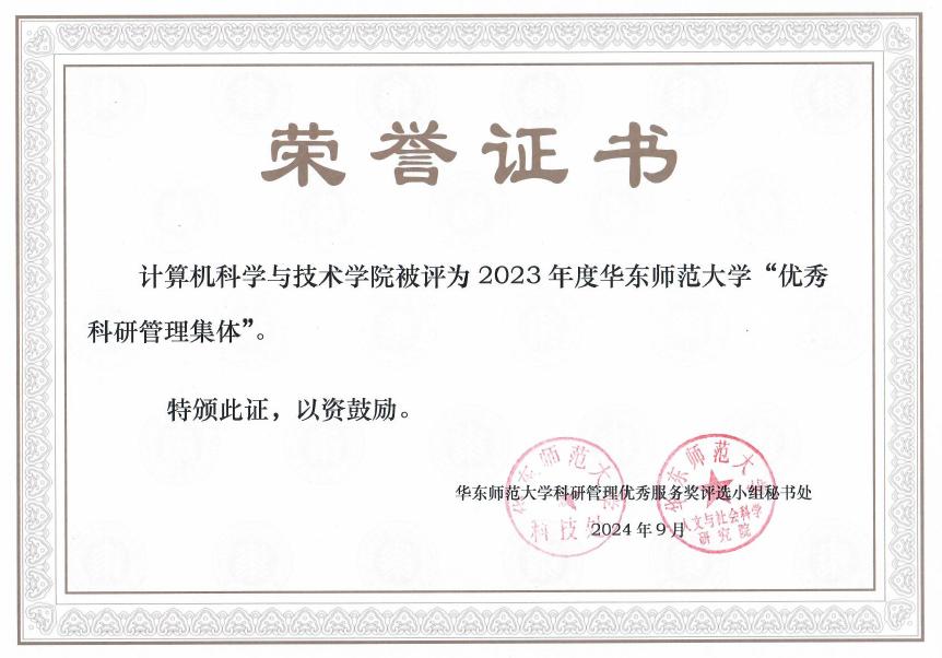近期,华东师范大学2023年度优秀科研管理集体与科研管理工作者评选结果公布,我院荣获优秀科研管理集体,这是全院师生共同努力的成果,也是学院大力开展学科交叉、创新科研管理制度、加强团队及青年人才培养、深化产学研合作等举措的结果。
