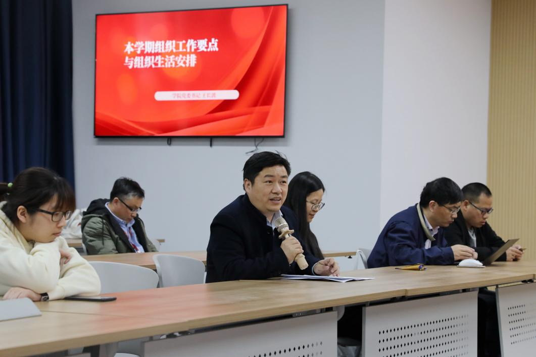 王长波介绍学校2023年度组织工作要点及学院党委的学期重点工作,他强调要以二十大精神学习为主线,积极做好校第十四次党代会的准备工作,不断促进卓越育人和学科高质量发展,支部工作要找亮点有特色,以党建引领促进中心工作发展。他对支部书记和委员提出了三点要求,一是要加强学习提升站位,二是要不断创新工作方法、改变工作思路,三是要团结协作,密切配合。