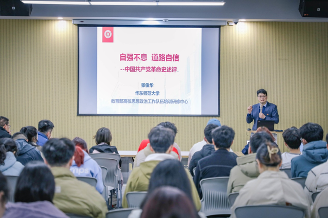 培训班的首场学习培训,特邀教育部高校思想政治工作队伍培训研修中心、华东师范大学马克思主义学院张俊华副教授,作题为《自强不息,道路自信——中国共产党革命史述评》报告。张老师通过对中国近现代遭受列强欺凌的原因、中国实现现代化复兴之路的探讨,以及为何唯有中国共产党能引领中国迈向现代化的深度解析,激发了同学们对党史、近现代史与现实问题的热烈讨论。他还着重指出,面对当今世界科技领域的激烈竞争,特别是在人工智能领域诸如ChatGPT、Sora等西方先进技术的冲击下,身为信息学科前沿专业的学子们,更应矢志不渝地追求卓越,致力于攻克关键核心技术难题,坚定走中国特色自主创新道路的信心。