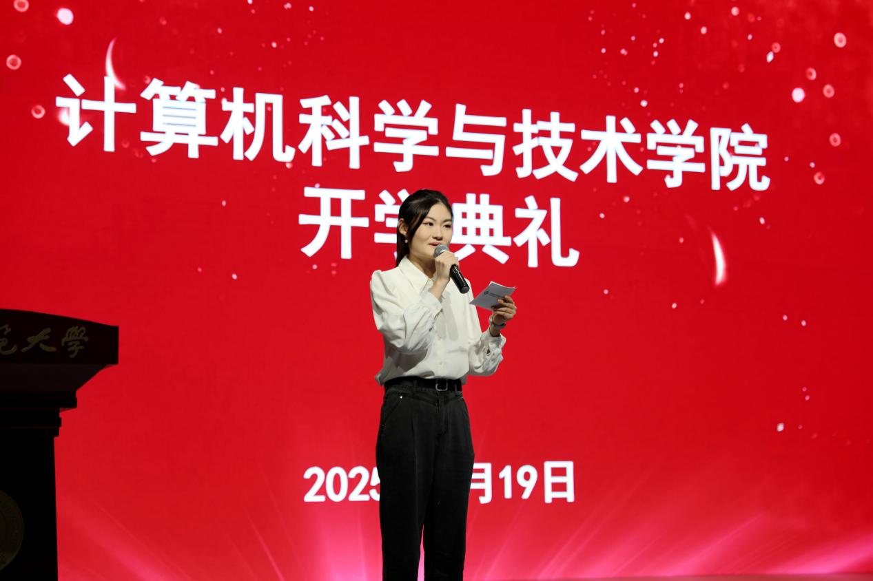 紧接着,研究生代表汤可成同学发言。她以“无限游戏”的视角比喻科研之路,强调研究生阶段不仅是学业的起点,更是人生的“升级”。她指出,科研充满未知与挑战,但更重要的是保持长期成长的心态,勇于跨越学科边界,不断提出问题并追寻答案。她将自己比作“正在训练的大模型”,鼓励同学们在不断学习与迭代中找到属于自己的“奖励函数”,保持对知识的渴望、对真理的追求和对社会的责任感。她还结合人工智能、大数据等前沿领域的发展,号召同学们以开放的心态迎接挑战,用青春与智慧书写属于这一代计算机学子的崭新篇章。